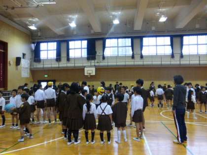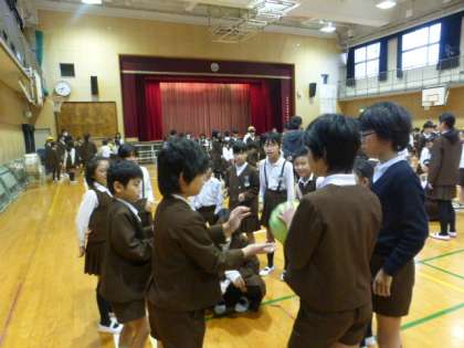 11月19日(木)晴れの予報でしたが、曇り空で少し寒い朝となりました。木曜日の朝は、児童集会があります。講堂に集まって、たてわり班で「ゴロ、ピカ、ドン」というゲームをしました。
