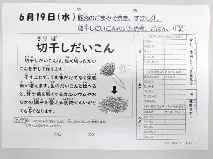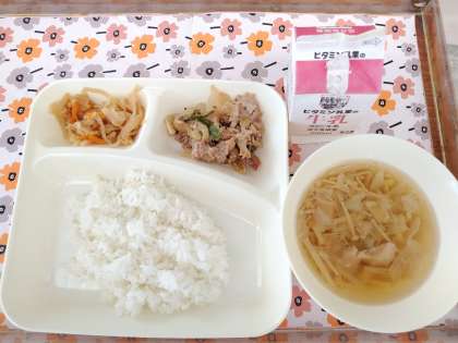 6/19今日の給食は「豚肉のごまみそ焼き、すまし汁、切干しだいこんのいため煮、ごはん、牛乳」です。