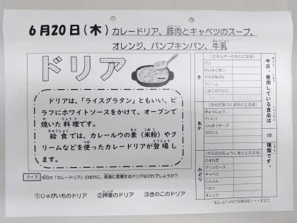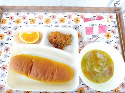 6/20今日の給食は「カレードリア、豚肉とキャベツのスープ、オレンジ、パンプキンパン、牛乳」です。