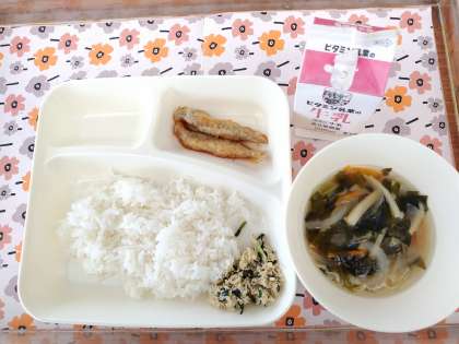 6/21今日の給食は「いわしてんぷら、五目汁、とりなっ葉いため、ごはん、牛乳」です。
