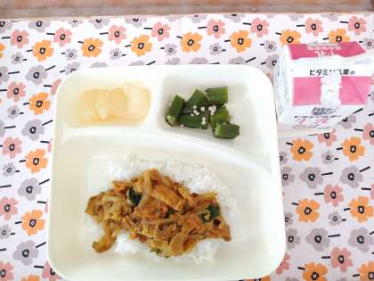 6/28の今日の給食は「和風カレー丼、オクラのかつお梅風味、和なし(カット缶)、牛乳」です。