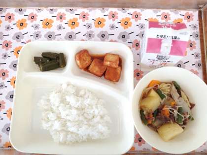 7/3今日の給食は、「肉じゃが、あつあげのみそだれかけ、オクラのおかかいため、ご飯、牛乳」です。