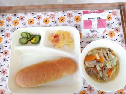 7/4今日の給食は「鶏肉とてぼ豆のスープ煮、ベーコンとじゃがいものチーズ焼き、きゅうりとコーンのサラダ、黒糖パン、牛乳」です!