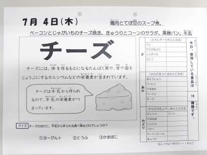 今日のチーズ焼きは、チーズの焦げ目も香ばしい、児童に人気の献立です。