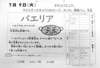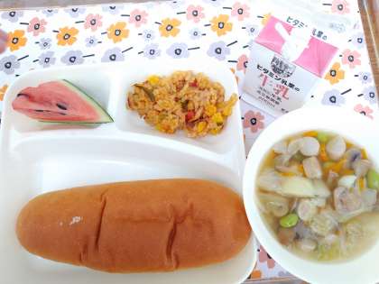 7/9今日の給食は「ウインナーとキャベツのスープ、すいか、黒糖パン、牛乳」です。
