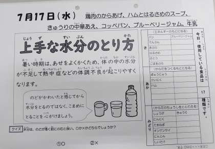 7/17今日の給食は「鶏肉のからあげ、ハムとはるさめのスープ、きゅうりの中華あえ、コッペパン、ブルーベリージャム、牛乳」です。