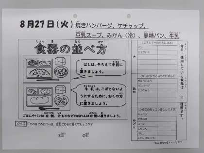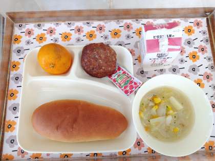 8/27今日の給食は「焼きハンバーグ(ケチャップ(袋))、豆乳スープ、冷凍みかん、黒糖パン、牛乳」です。