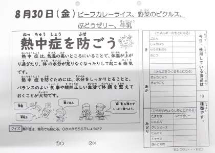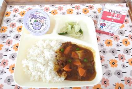 8/30今日の給食は「ビーフカレーライス、野菜のピクルス、ぶどうゼリー、牛乳」です。