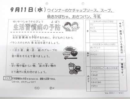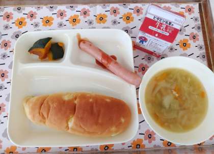 9/11今日の給食は「ウインナーのケチャップソース、スープ、焼きかぼちゃ、おさつパン、牛乳」です。