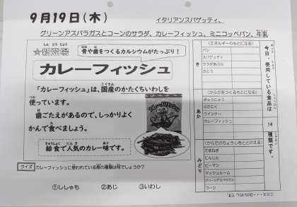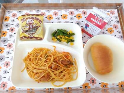 9/19今日の給食は「イタリアンスパゲッティ、グリーンアスパラガスとコーンのサラダ、カレーフィッシュ、ミニコッペパン、牛乳」です!
