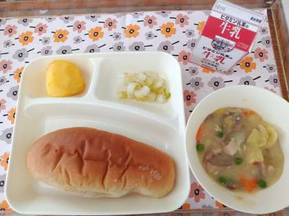 10/16今日の給食は「鶏肉とさつまいものシチュー、はくさいのピクルス、かき(平核無柿)黒糖パン、牛乳」です。