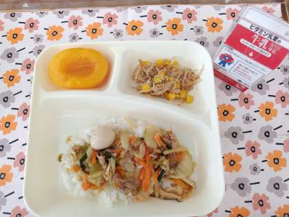 10/18今日の給食は「中華丼、もやしとコーンのごまいため、黄桃(缶)、牛乳」です。
