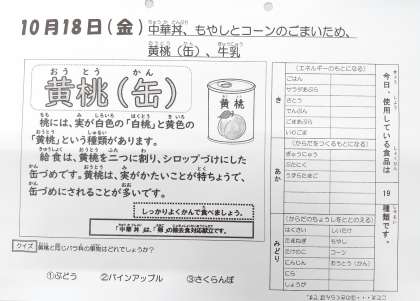 今日は黄桃(缶)ですが、給食で提供している、果物(缶)は全部国産の果物を使用して作っています。