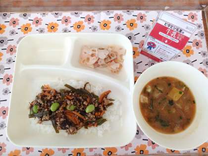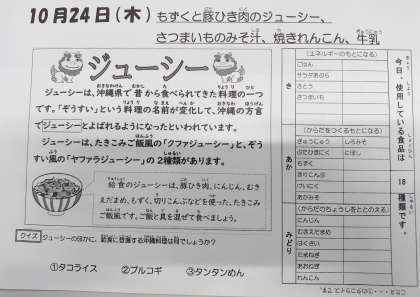 10/24今日の給食は「もずくと豚ひき肉のジューシー、さつまいものみそ汁、焼きれんこん、牛乳」です。