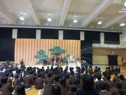 12月14日(月)大阪能楽協会の方々にお越しいただき、能の体験学習を行いました。謡を練習したり、能面体験などをしました。最後の能「土蜘蛛」を鑑賞しました。蜘蛛の糸に見立てた細い白いテープがたくさんまかれて、迫力満点でした。