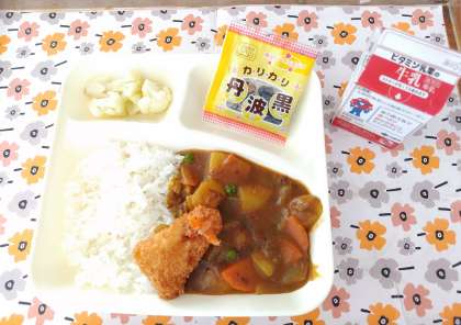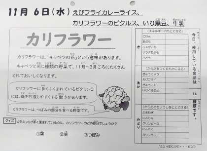 11/6今日の給食は「えびフライカレーライス、カリフラワーのピクルス、いり黒豆、牛乳」です。