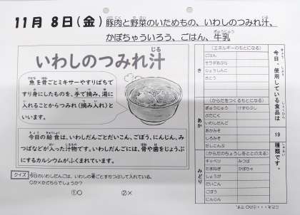 11/8今日の給食は「豚肉と野菜のいためもの、いわしのつみれ汁、かぼちゃういろう、ごはん、牛乳」です。