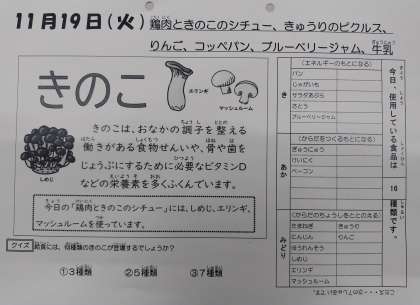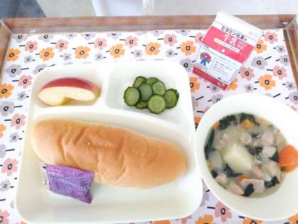 11/19今日の給食は「鶏肉ときのこのシチュー、きゅうりのピクルス、りんご、コッペパン、ブルーベリージャム、牛乳」です。