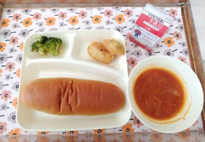 11/26今日の給食は「白身魚フリッター、ミネストローネ、ブロッコリーのサラダ、黒糖パン、牛乳」です。