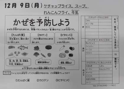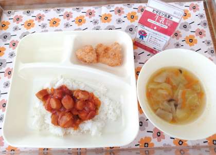 12/9今日の給食は「ケチャップライス、スープ、れんこんフライ、牛乳」です。