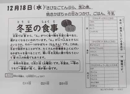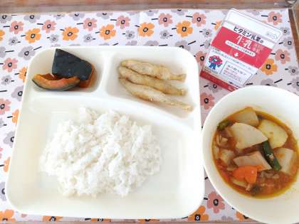 12/18今日の給食は「きびなごてんぷら、含め煮、焼きかぼちゃの甘みつかけ、ごはん、牛乳」です。