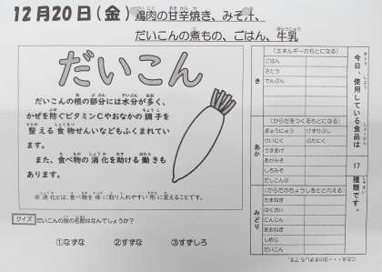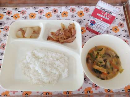 12/20今日の献立は「鶏肉の甘辛焼き、みそ汁、だいこんの煮もの、ごはん、牛乳」です。