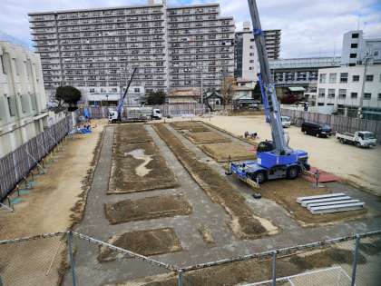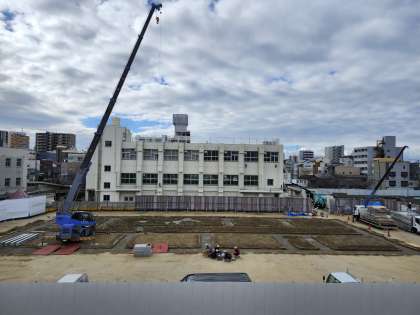 重機が入って鉄骨が運ばれています