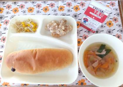 1/9今日の給食は「鶏肉のからあげ、ハムと野菜の中華スープ、もやしとコーンの中華あえ、レーズンパン、牛乳」です。