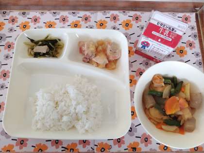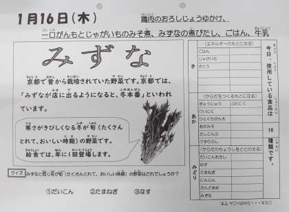 1/16今日の給食は「鶏肉のおろしじょうゆかけ、一口がんもとじゃがいものみそ煮、みずなの煮びたし、ごはん、牛乳」です。
