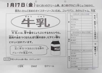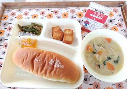 1/17今日の給食は「はくさいのクリーム煮、あつあげのピリ辛じょうゆかけ、豚肉とさんどまめのオイスターソースいため、コッペパン、みかんジャム、牛乳」です。