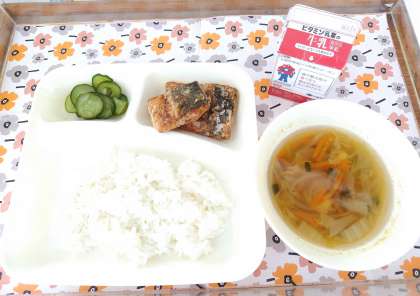 1/22今日の給食は「さばのカレーたつたあげ、五目汁、きゅうりの甘酢あえ、ご飯、牛乳」です。