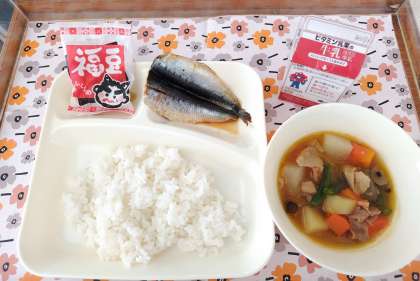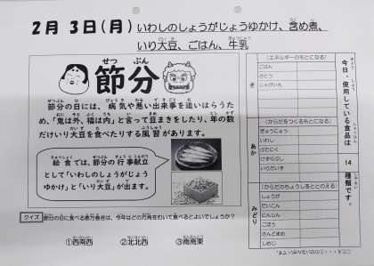 いわしのしょうがじょうゆかけは、開いたいわしを焼き、しょうがじょうゆをかけています。今日は節分の行事献立です。
