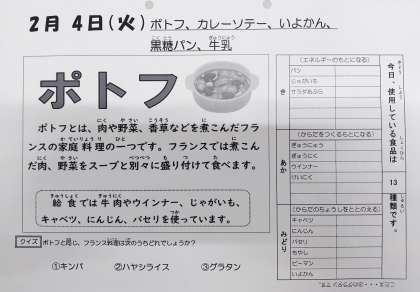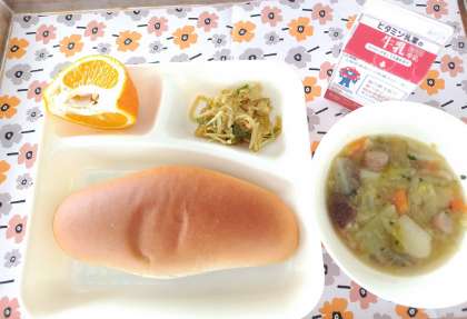 2/4今日の給食は「ポトフ、カレーソテー、いよかん、黒糖パン、牛乳」です。