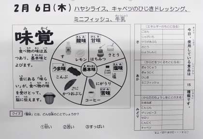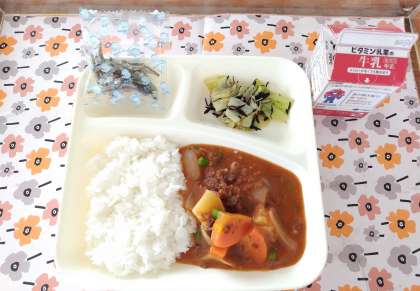 2/6今日の給食は「ハヤシライス、キャベツのひじきドレッシング、ミニフィッシュ、牛乳」です。