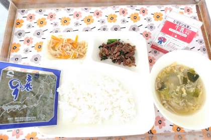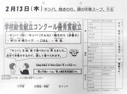2/13今日の給食は「キンパ、焼きのり、卵の中華スープ、牛乳」です。