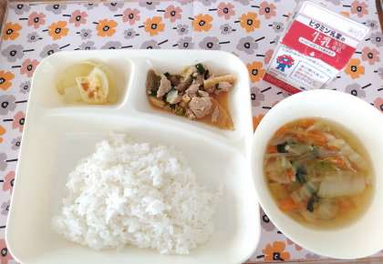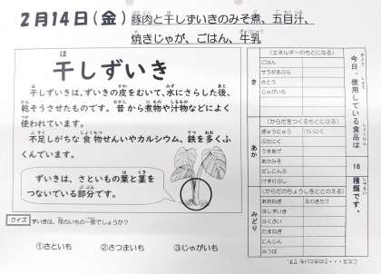 2/14今日の給食は「豚肉と干しずいきのみそ煮、五目汁、焼きじゃが、ごはん、牛乳」です。