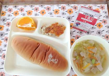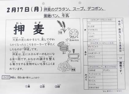 2/17今日の給食は「押麦のグラタン、スープ、デコポン、黒糖パン、牛乳」です。