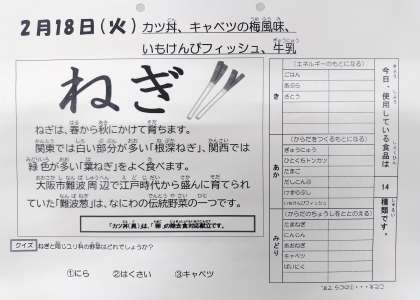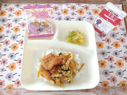 2/18今日の給食は「カツ丼、キャベツの梅風味、いもけんぴフィッシュ、牛乳」です。
