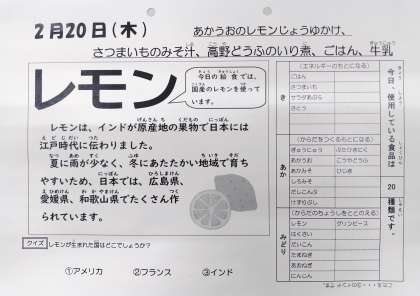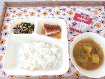 2/20今日の給食は「あかうおのレモンじょうゆかけ、さつまいものみそ汁、高野どうふのいり煮、ごはん、牛乳」です。