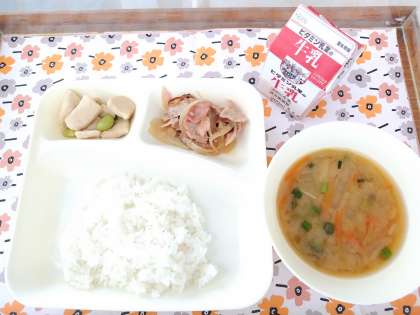 3/3今日の給食は「豚肉のしょうが焼き、みそ汁、高野どうふの煮もの、ごはん、牛乳」です。