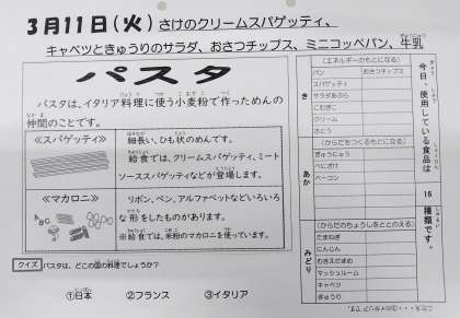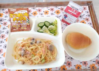 3/11今日の給食は「さけのクリームスパゲッティ、キャベツときゅうりのサラダ、おさつチップス、ミニコッペパン、牛乳」です。