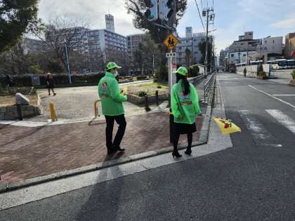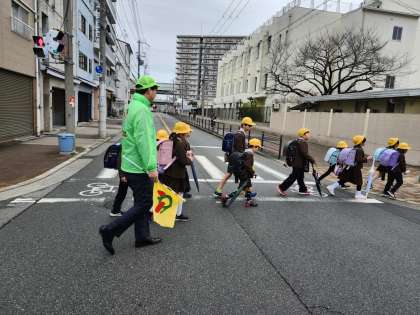 雨の日も風の日も子どもたちの登校を見守ってくださる尼崎信用金庫の行員の皆様