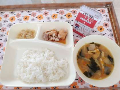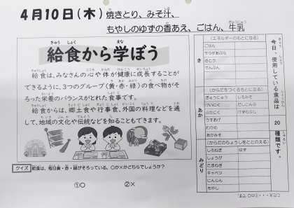 4/10今日の給食は「焼きとり、みそ汁、もやしのゆずの香あえ、ご飯、牛乳」です。