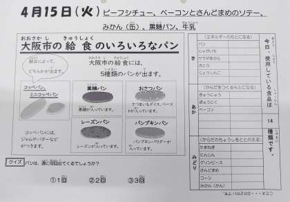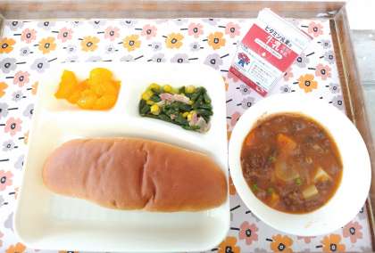 4/15今日の給食は「ビーフシチュー、ベーコンとさんどまめのソテー、みかん(缶)、黒糖パン、牛乳」です。