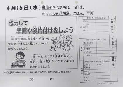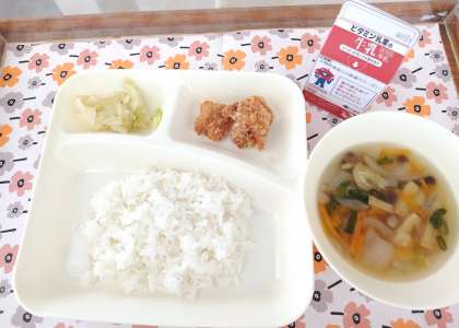 4/16今日の給食は「鶏肉のたつたあげ、五目汁、キャベツの梅風味、ご飯、牛乳」です。