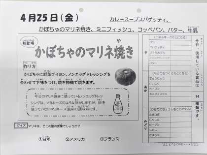 4/25今日の給食は「カレースープスパゲッティ、かぼちゃのマリネ焼き、ミニフィッシュ、コッペパン、バター、牛乳」です。