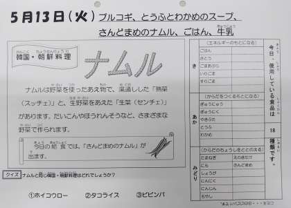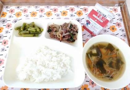 5/13今日の給食は「プルコギ、とうふとわかめのスープ、さんどまめのナムル、ごはん、牛乳」です。