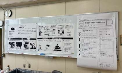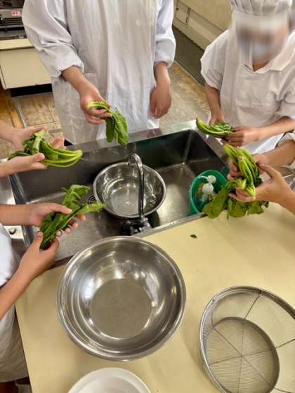 昨日は5ー2、今日は5ー1が5年生になって初めての調理実習を行いました。お茶をおいしくいただいた後、青菜のおひたしを作り始めていました。班のみんなでほうれん草をしっかり洗う所からスタート。初めてだからか、少し緊張した様子でがんばっていました。