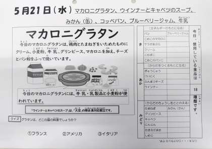 5/21今日の給食は「マカロニグラタン、ウインナーとキャベツのスープ、みかん(缶)、コッペパン、ブルーベリージャム、牛乳」です。