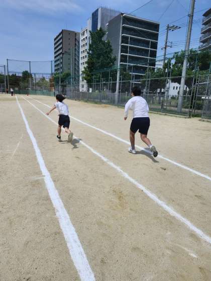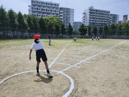 6年生は自分たちのソフトボール投げと50m走を終えて、2時間連続で、1年生の初めてのスポーツテストをサポートします